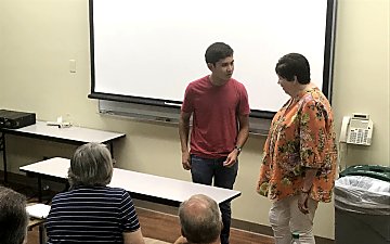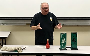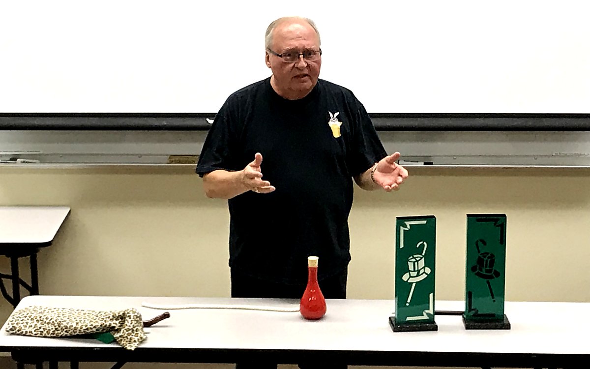Dan Hecke was up next with his bag of wands. Much like golfers with their favorite clubs, he introduced various wands to the audience and ended up with a break-a-way fan. Next he wowed the audience with a mystic rope and bottle trick. For the biggest applause though, he broke out his valuable antique 'hipity hop' rabbits and amazed everyone as they magically traded places under covered containers.